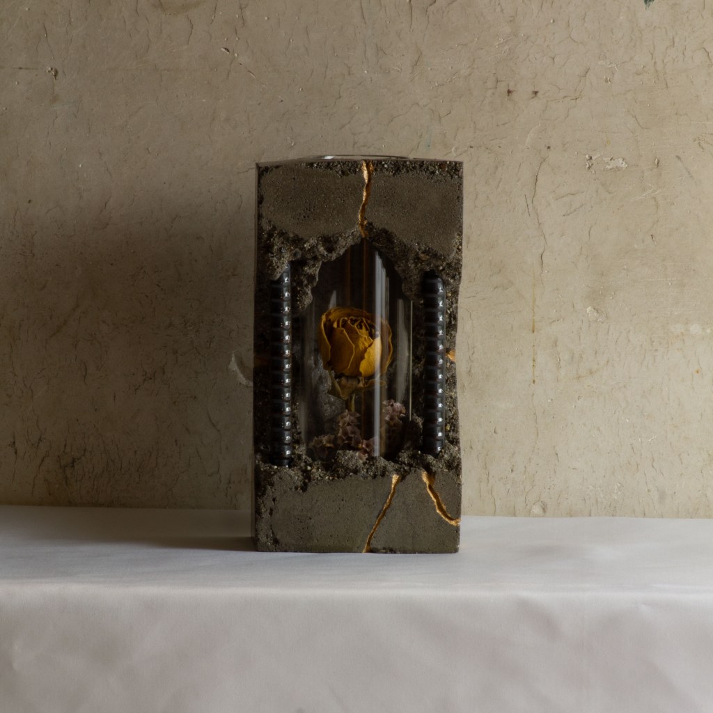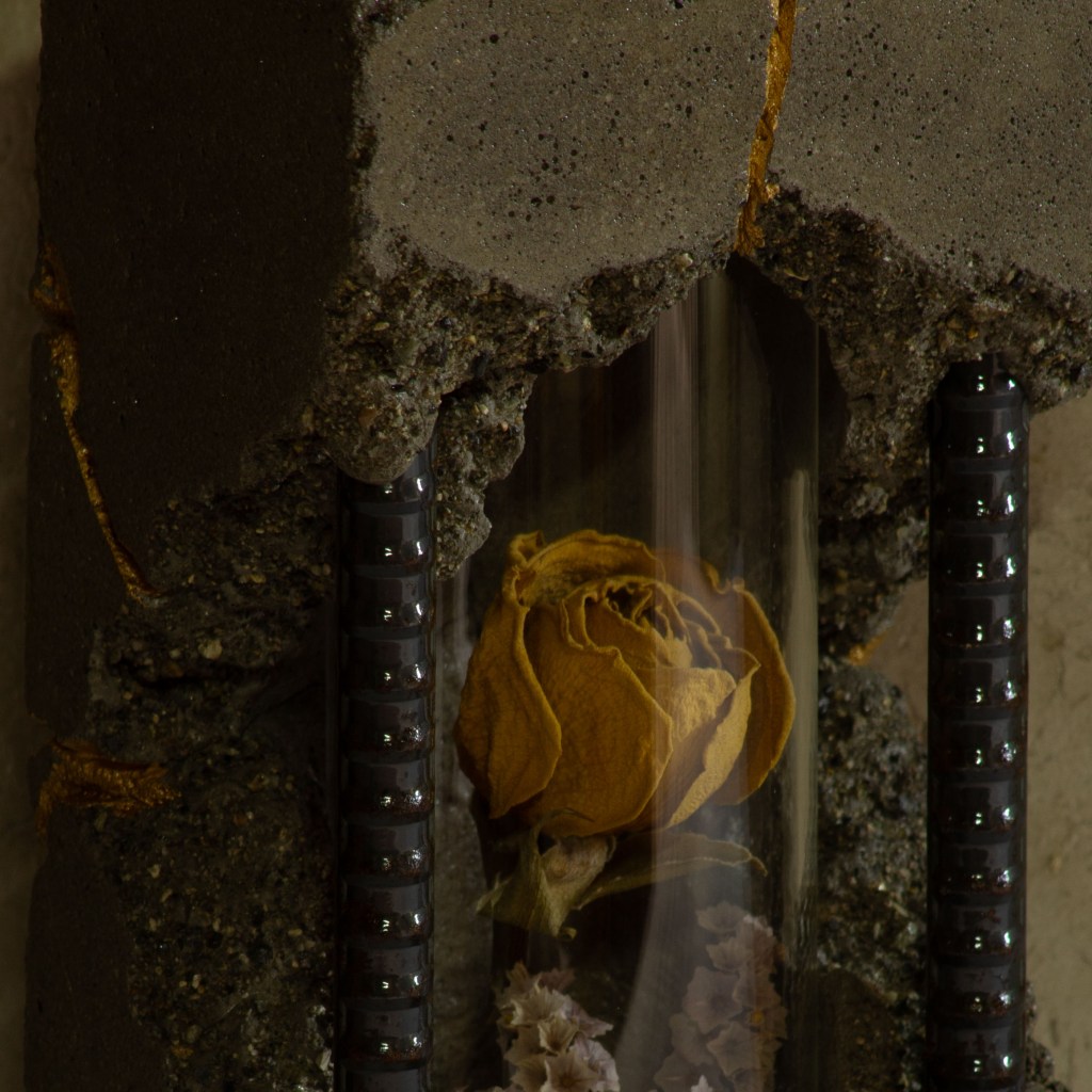 コンクリートの無機質さ、鉄筋による退廃感、そして対比になる生き生き輝く花。